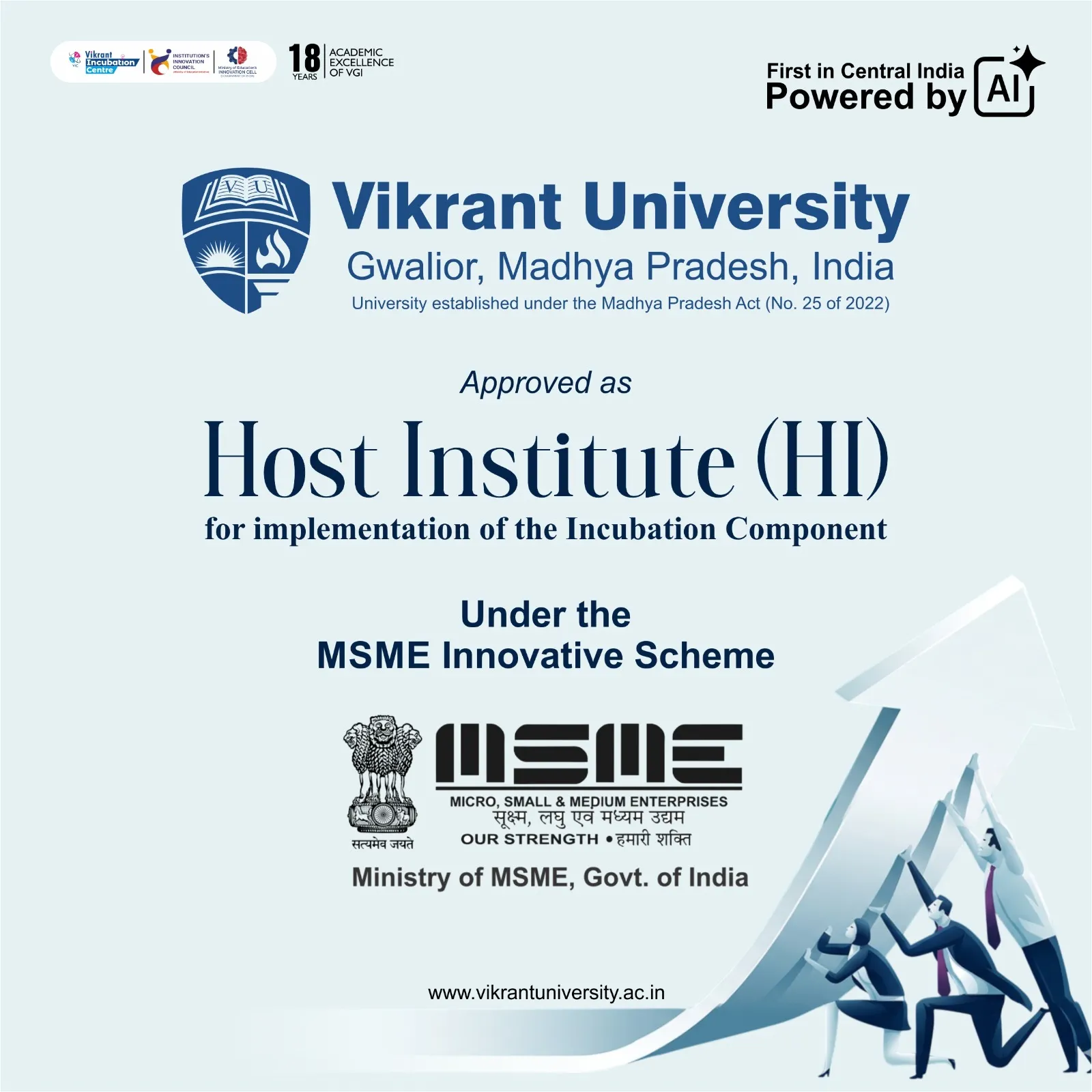 Vikrant University has received recognition from the Ministry of Micro, Small and Medium Enterprises to become a Host Institute (HI) for the implementation of the incubation component under the MSME Innovative scheme. It is a proof that the university is gradually making progress in promoting innovation and entrepreneurship among the academic community. With the grant-in-aid, Vikrant University ensures innovation, nurtures nascent enterprises, and assists in turning their ideas into actionable innovations. The initiative will provide mentorship and infrastructure for upcoming innovators to shape tomorrow’s leaders.