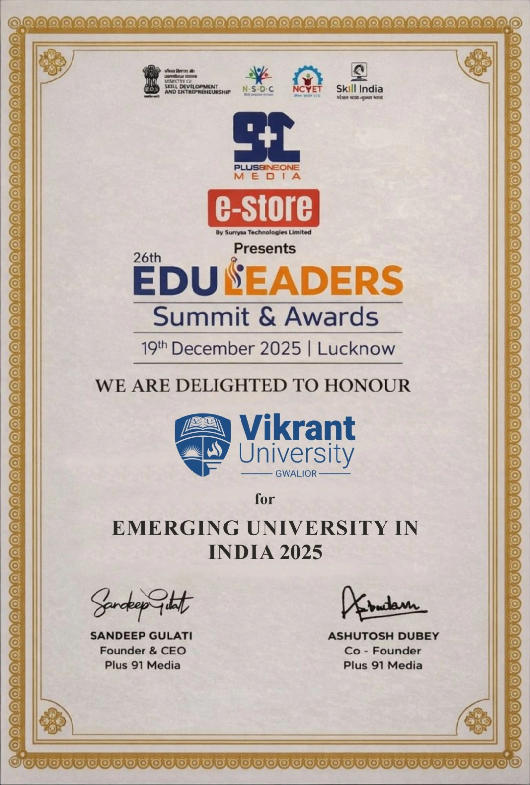 Vikrant University is proud to share a moment of great achievement and recognition. The University has been awarded as the Best Emerging University in India 2025 by +91 Media (Plus Nine One Media) and was presented during the 26th Eduleader Summit held in Lucknow - a premier event to honour the best practices and accomplishments of higher education institutions throughout India.